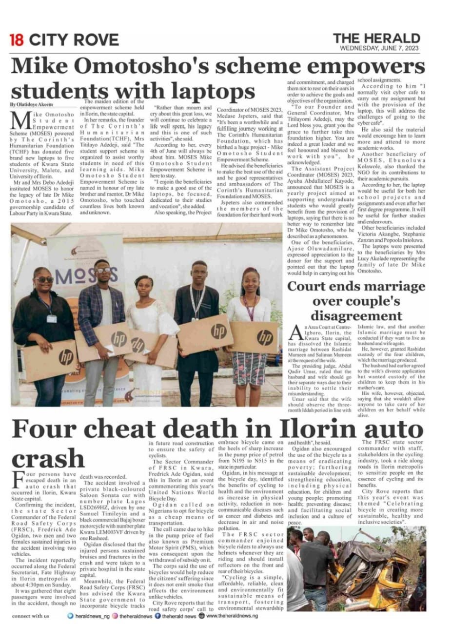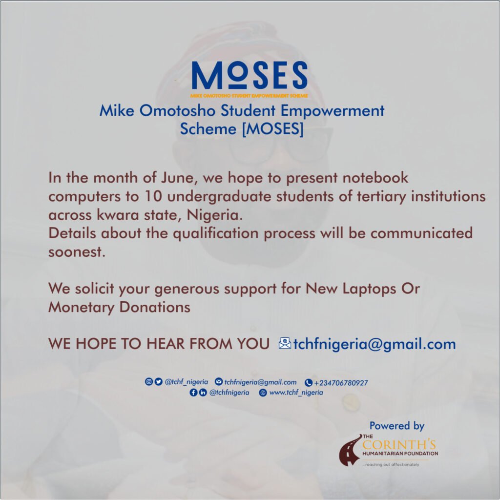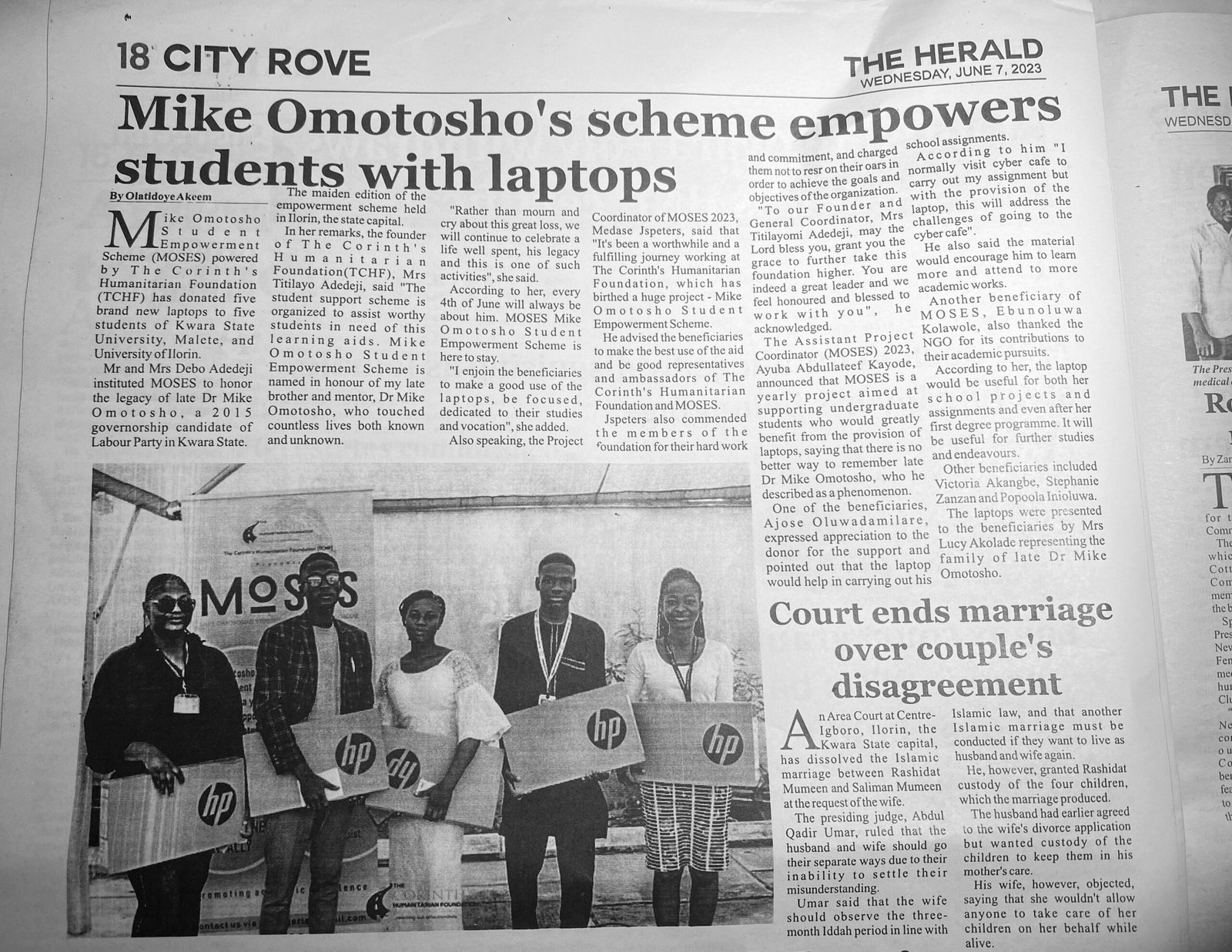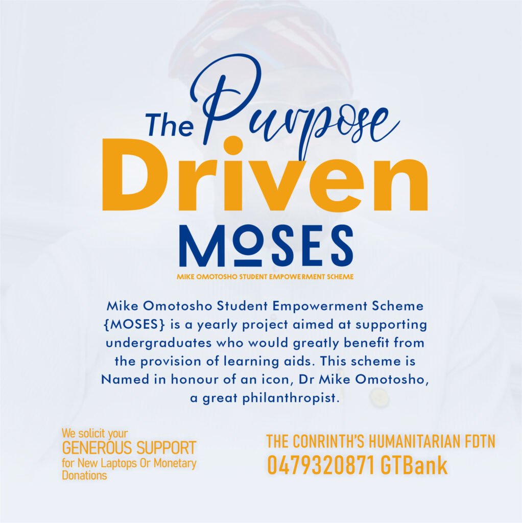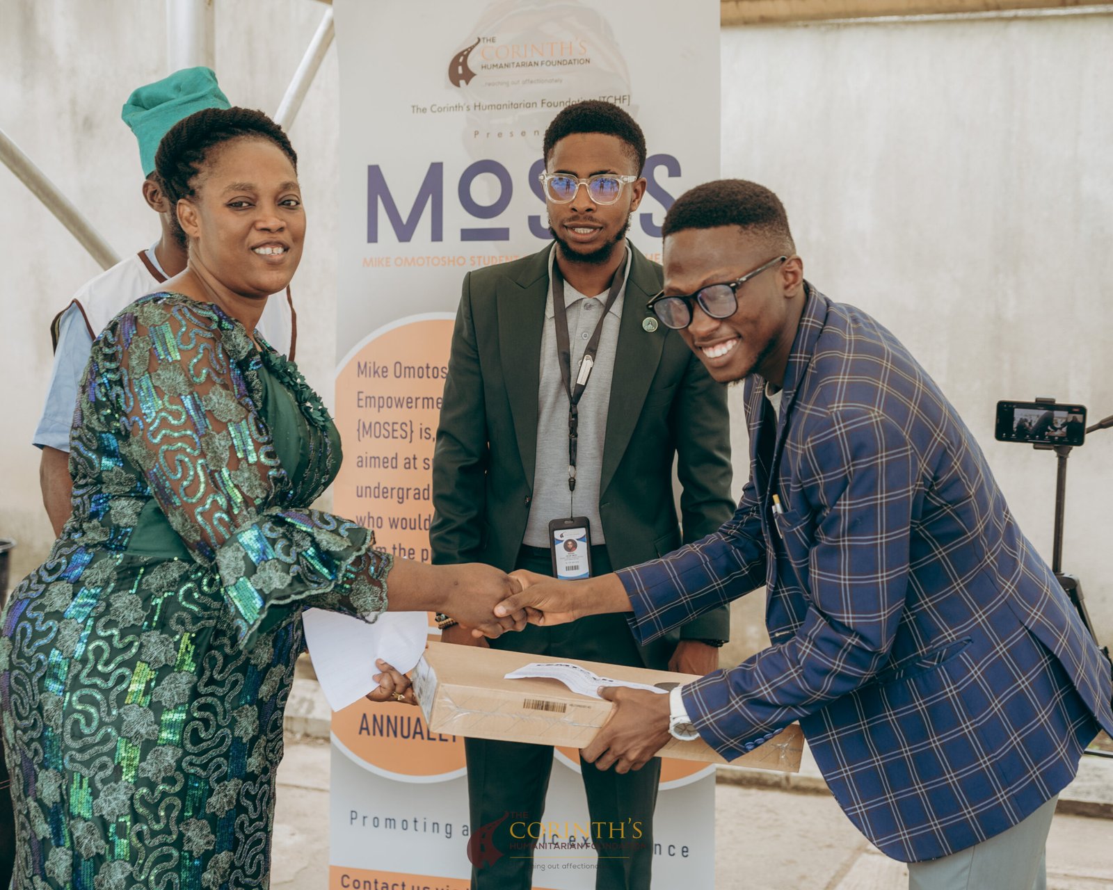 In 2023, The Corinth’s Humanitarian Foundation (TCHF) proudly launched the Mike Omotosho Student Empowerment Scheme (MOSES) in tribute to the late Dr. Mike Omotosho. This initiative is dedicated to empowering students by providing essential learning tools, ensuring they have the resources needed to excel academically and build a brighter future.