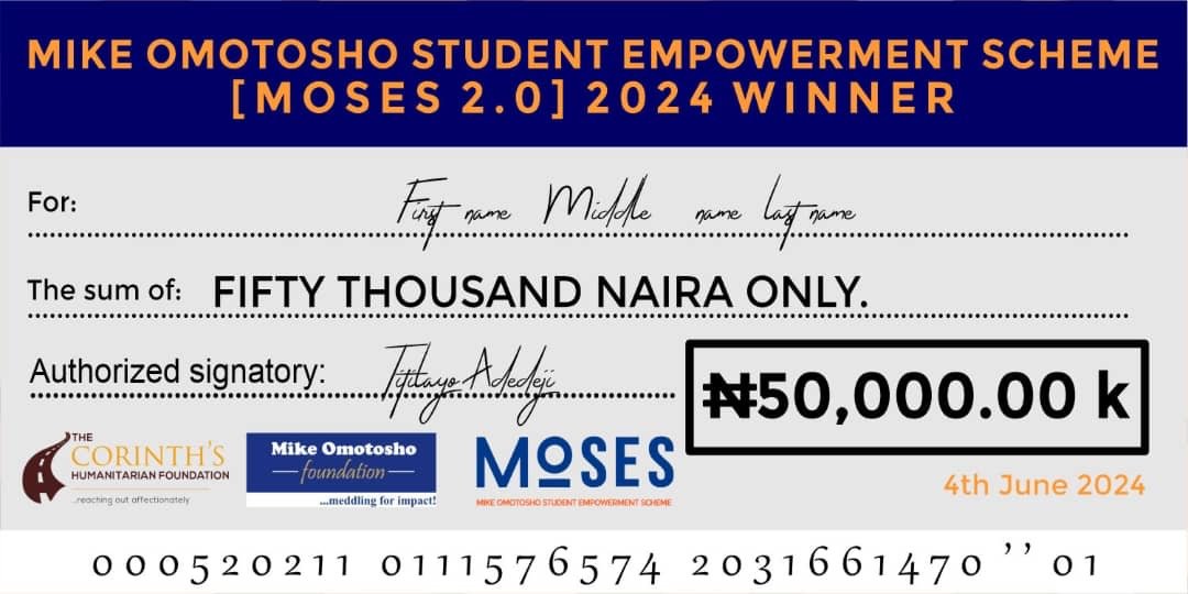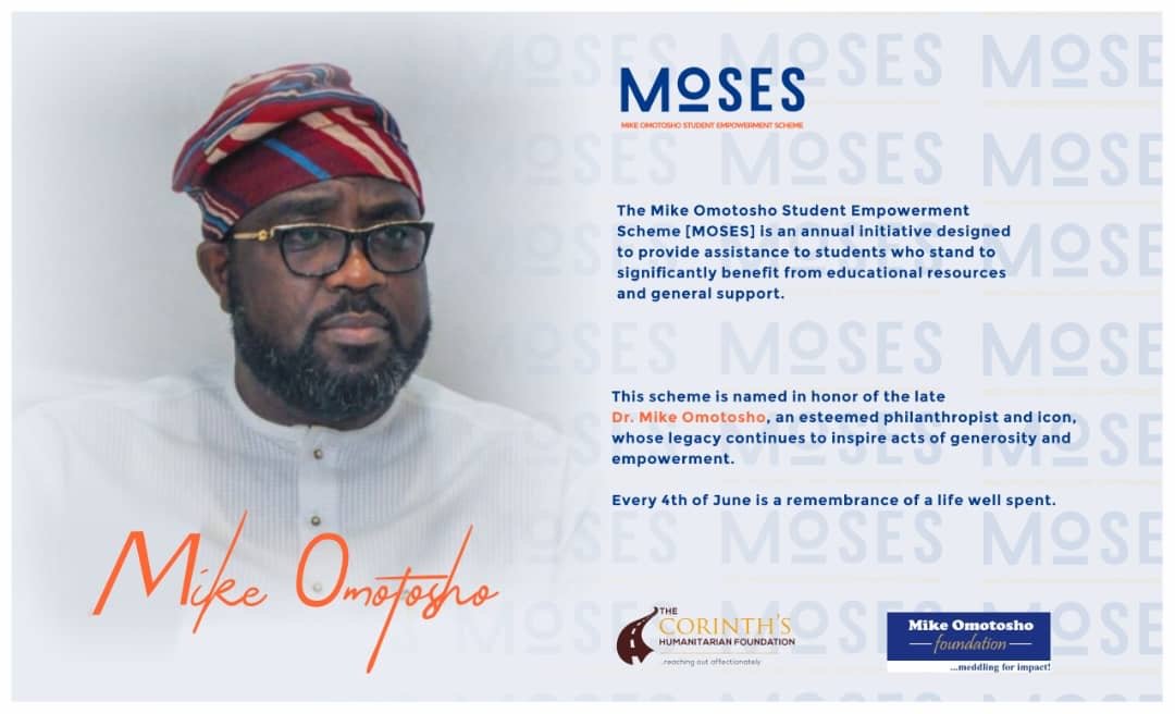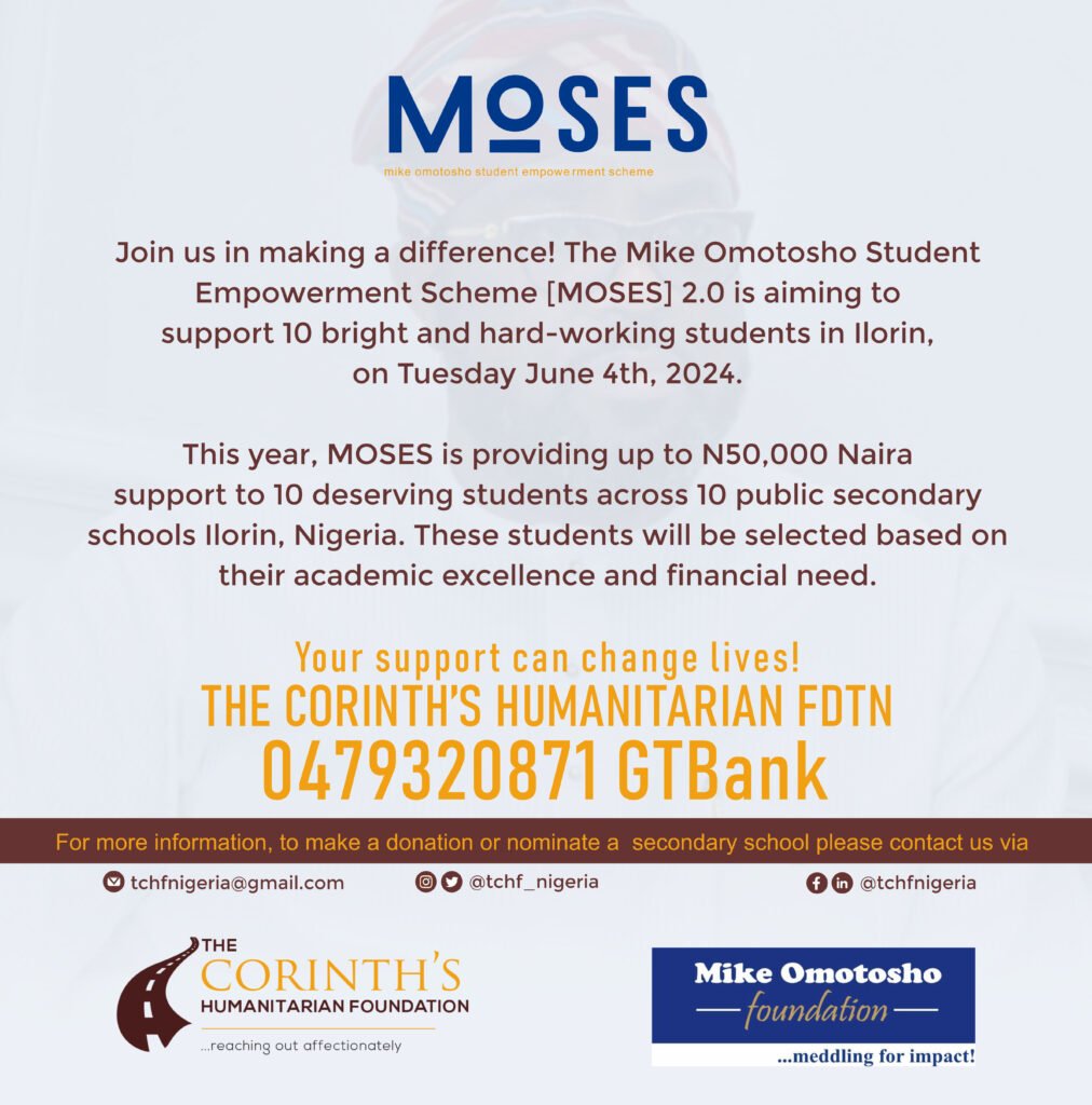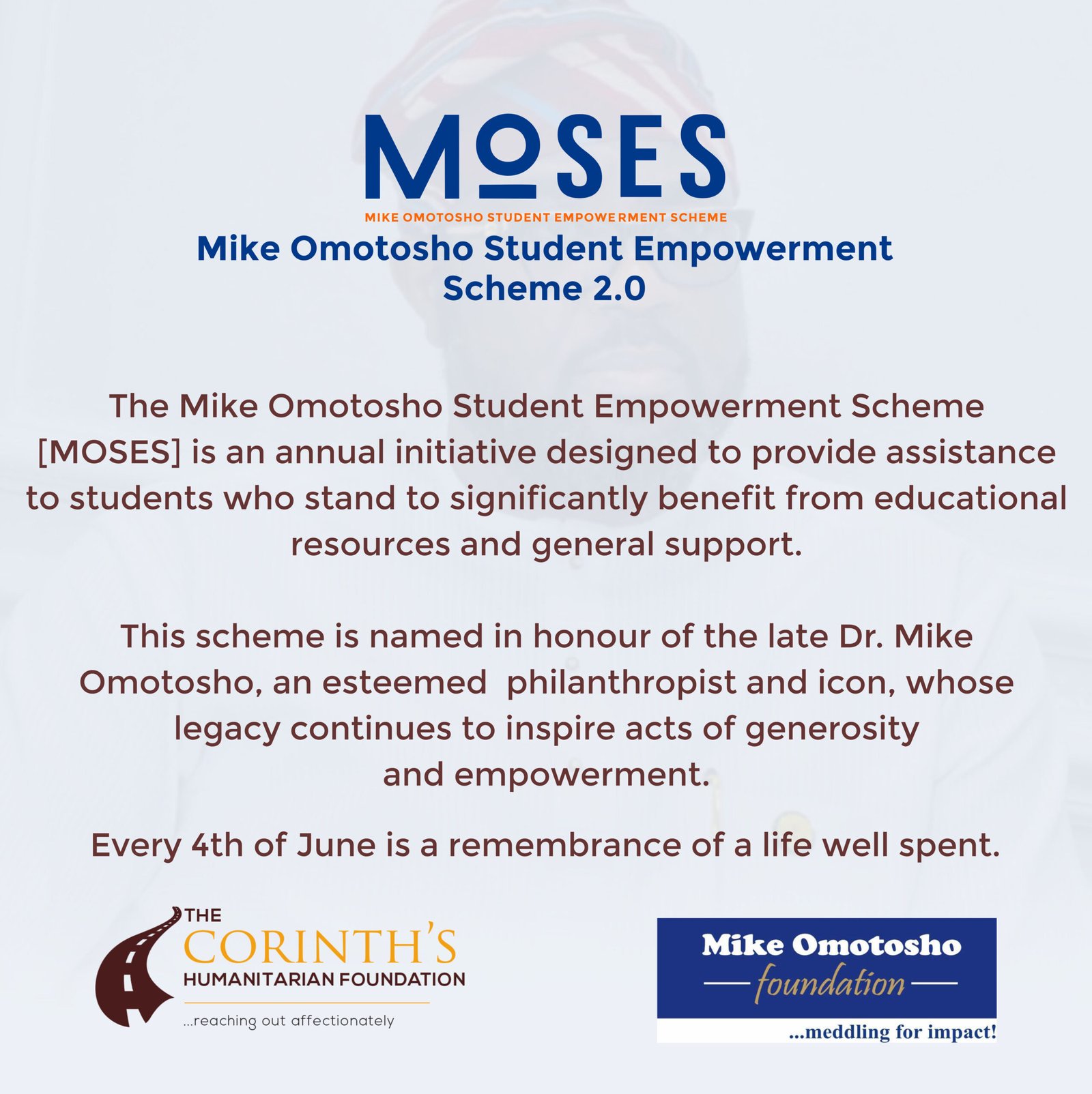 The Mike Omotosho Student Empowerment Scheme (MOSES) is a beacon of hope for academically talented students facing financial difficulties. Established by The Corinth’s Humanitarian Foundation, this annual initiative continues to change lives by ensuring deserving students have access to quality education.
